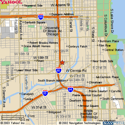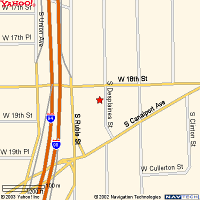 | Directions to Dogmatic: 1822 South Des Plaines While driving south on the 90/94 just past the Loop exit 18th Street. Turn left onto 18th and drive under the freeway. Go straight through the light. Take a right at the next block Des Plaines, Dogmatic is half a block down on the right [west] side. [Don't worry about the one way sign on Des Paines it is only for north of 18th] For other directions click on a map and enter your adress into yahoo maps directions. |